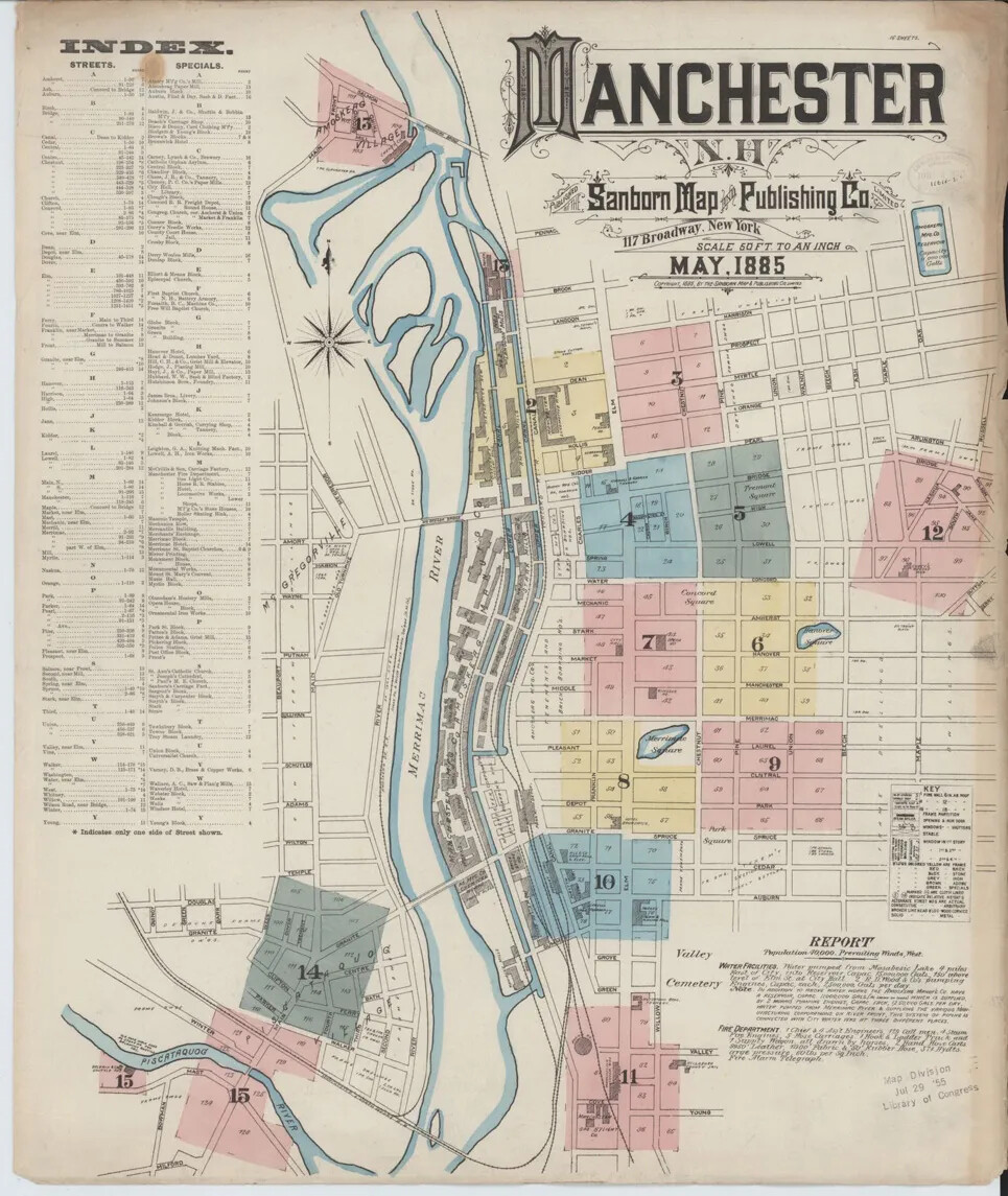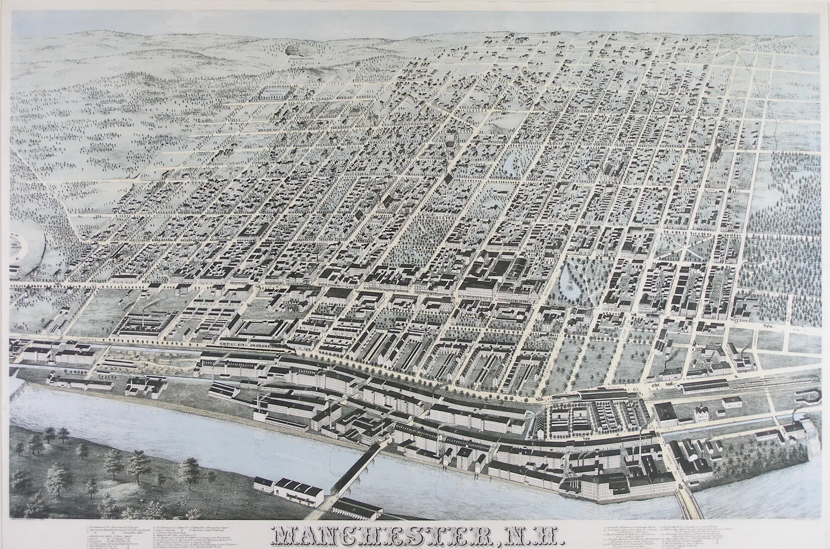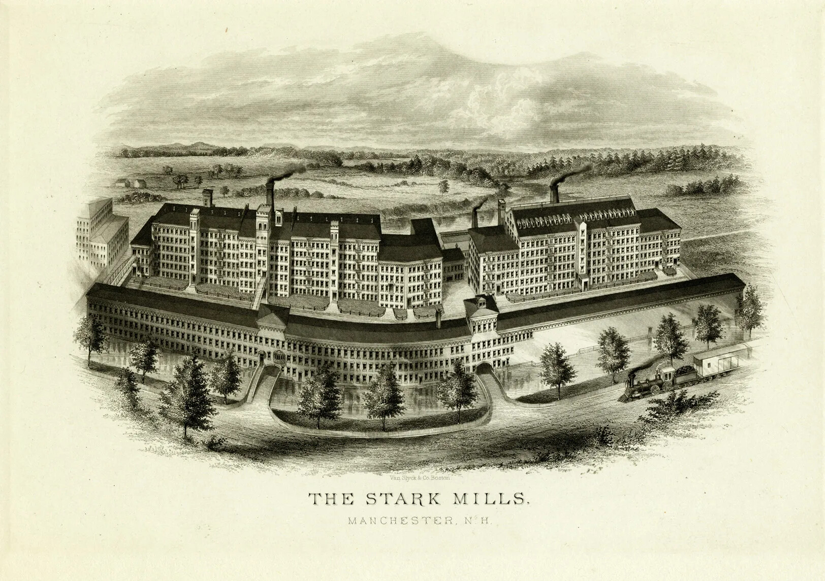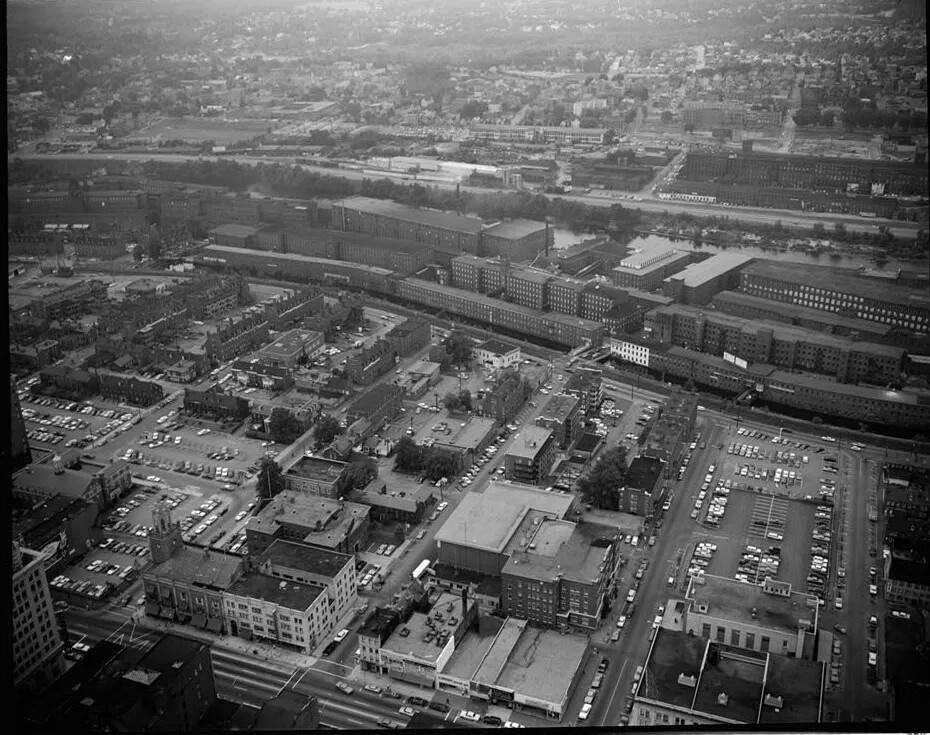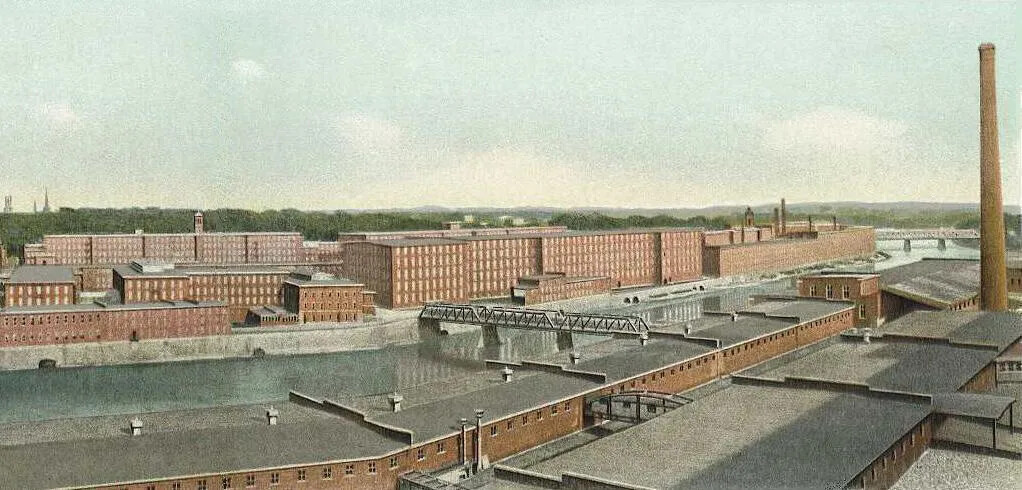 The city of Manchester expanded alongside the Amoskeag Manufacturing Company, with much of the city’s development controlled by the company. Amoskeag planned out the city’s center along Elm Street, set aside land for public parks, and organized housing for its employees.
