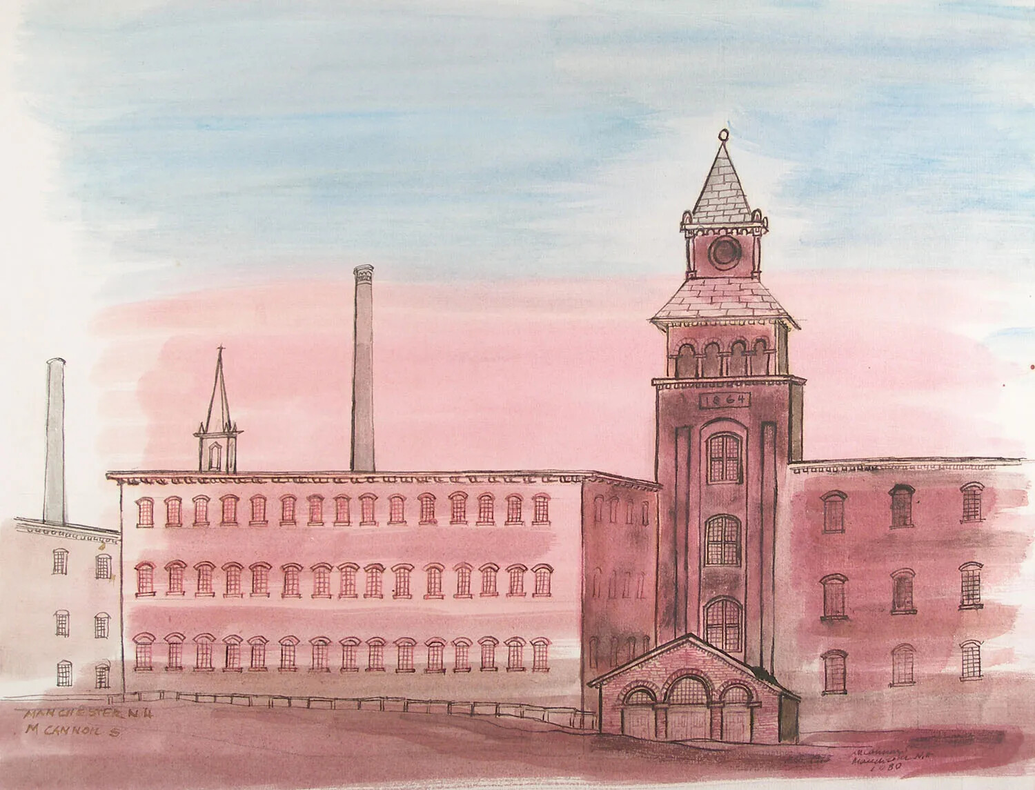 Manchester began as a small farming village located several miles east of the Merrimack River. It was originally called Derryfield. The town’s potential as an industrial center was first recognized by Samuel Blodget, local businessman, inventor, and entrepreneur who built a canal-and-lock system on the Merrimack River near the Amoskeag Falls. When Blodget’s canal system opened in 1807, it allowed boats travelling between Concord and Nashua to bypass the steep falls completely, thereby providing for water travel north of the falls, which opened this area of the state to development. At that time, water travel was the most efficient way to transport goods and people, so the navigability of the Merrimack, the largest river in central New Hampshire, was of prime importance. Within a few years, through the construction of other canals and locks, the Merrimack would link Concord to Boston, opening up for central New Hampshire all sorts of possibilities for trade and industry.
