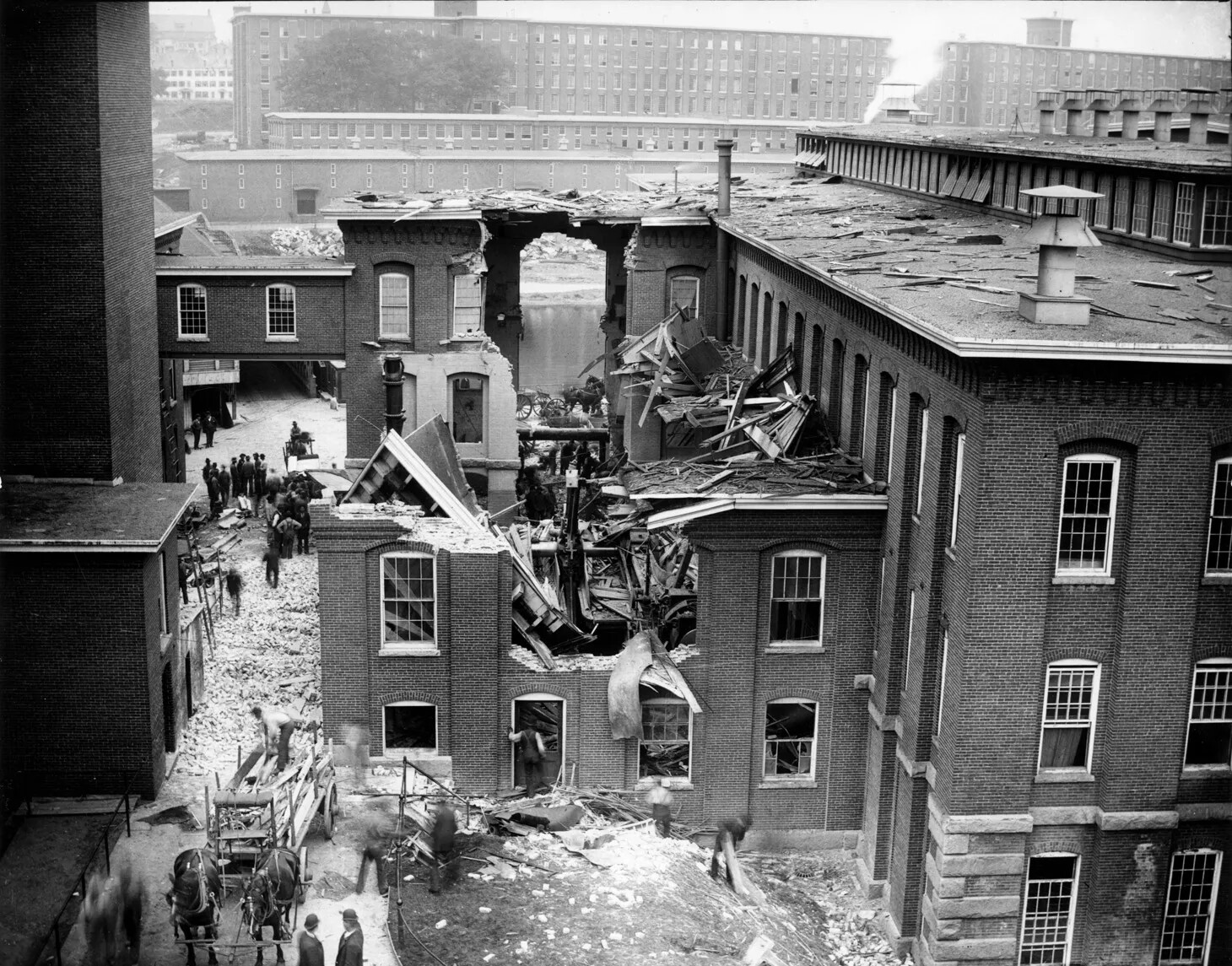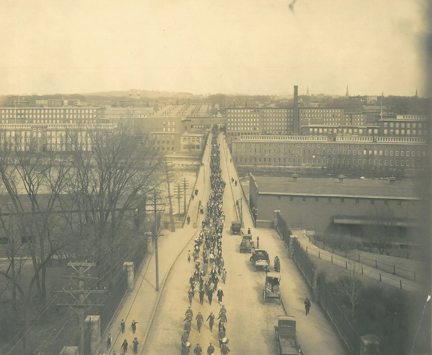 Once the dominating industry in Manchester, the Amoskeag Manufacturing Company began to lose its grip on both its workers and its stance in the textile world in the 1920s. Though Manchester was long considered the “strike-less city,” the loyalty felt by Amoskeag workers towards the company began to recede after Amoskeag announced a 20 percent cut in pay and an increase in the work week from 48 hours to 54 hours in February 1922. The resulting “Strike of 1922,” lasting nine months, cost the company and its employees millions of dollars in production and wages. Aging machinery and the Great Depression of the 1930s provided the final blows. On December 24, 1935, the Amoskeag Manufacturing Company closed its doors and filed for bankruptcy. Damage inflicted upon the mill buildings by a massive flood in the spring of 1936 further solidified the closure of the millyard.