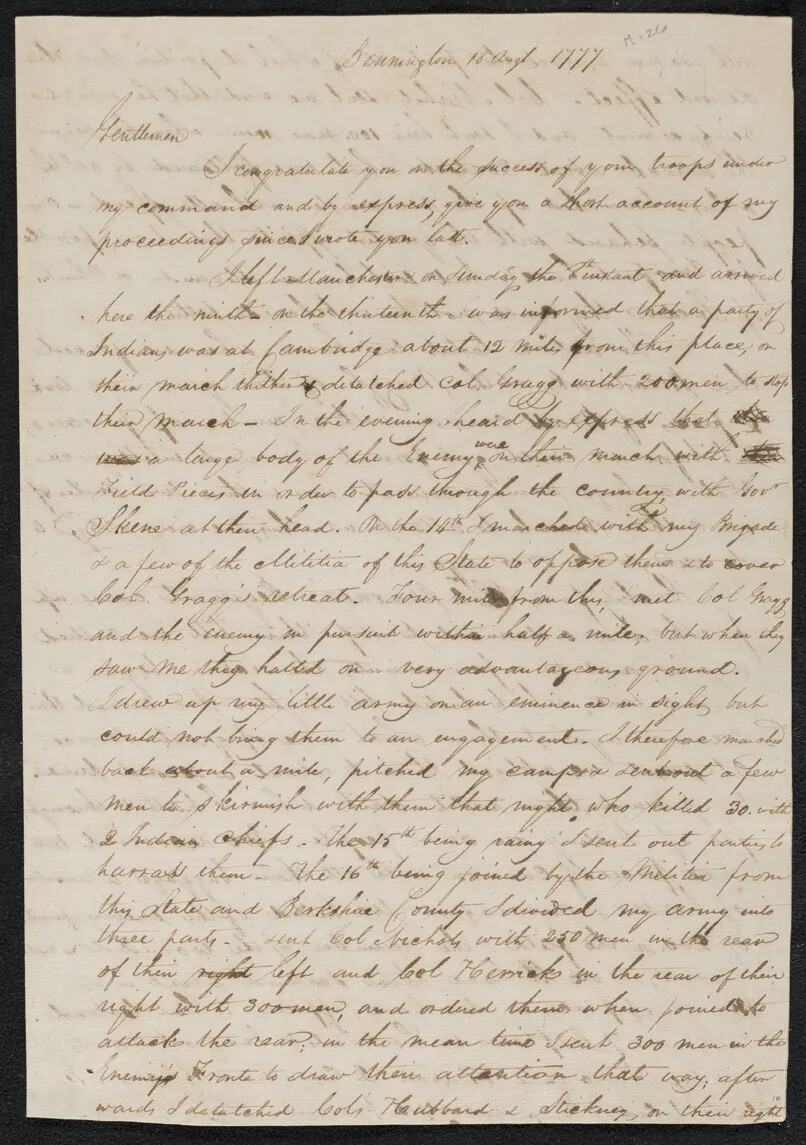 When the American Revolution broke out in 1775, Stark emerged as a natural leader of New Hampshire troops when they played a pivotal role at the Battle of Bunker Hill. Stark also served under George Washington at Princeton and Trenton. With a mercurial temper, Stark earned a reputation as being difficult to work with but a hardened and skilled commander. His men were fiercely loyal to him. When the British launched a campaign through New York and Vermont in the summer of 1777, prompting Vermont to send a frantic plea to its New England neighbors for troops, New Hampshire was the only state to respond, sending Stark and a contingent of New Hampshire men to southwestern Vermont to protect the local populace.