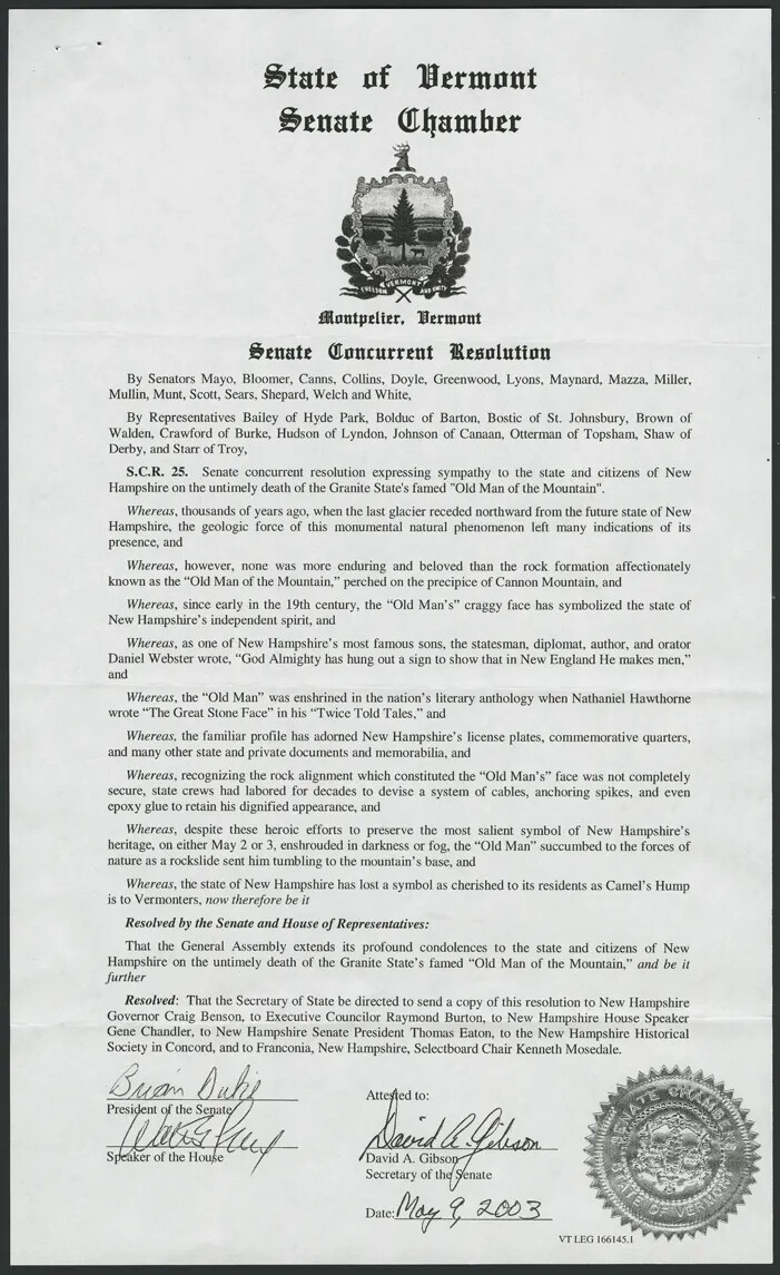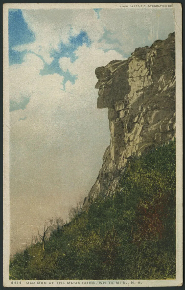 Though its exact age at the time of its fall from the side of Cannon Mountain is debatable, we know the remarkable rock formation known as the Old Man of the Mountain looked out over Franconia Notch for thousands, if not millions, of years. It inspired writers, artists, musicians, and politicians, not to mention the tens of thousands of visitors and hikers who explored the Notch every year for the purpose of seeing it themselves. Officially named a state emblem in 1945, the rugged “face” of the Old Man was widely embraced as a miraculous symbol of the character of the state of New Hampshire.