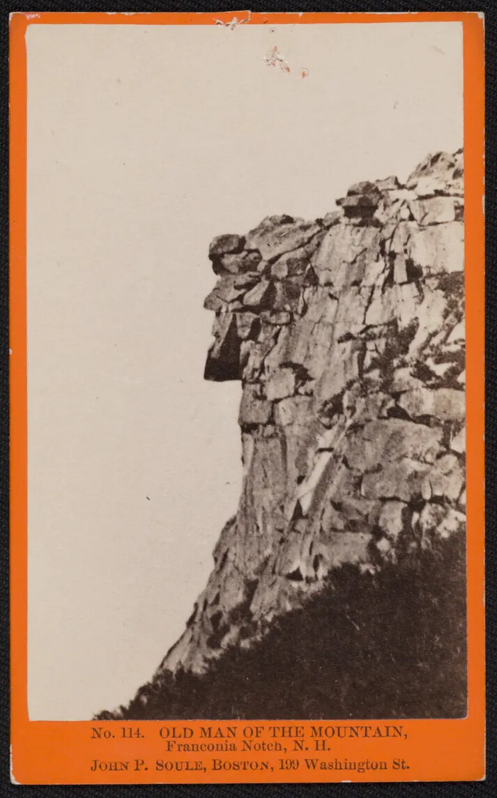 The first appearance of the Old Man in print did not appear until 1828, when an issue of the American Journal of Science & Arts published a sketch and description of the natural wonder. Around the same time, New Hampshire experienced a boom in tourism as travelers eager to explore the White Mountains prompted expansion of railroads and the construction of inns and hotels. The “profile” on Cannon Mountain, which was then called Profile Mountain, was one of the White Mountains’ most popular attractions and also inspired the naming of the nearby lake, one of the region’s grandest hotels, and even a branch of the railroad.