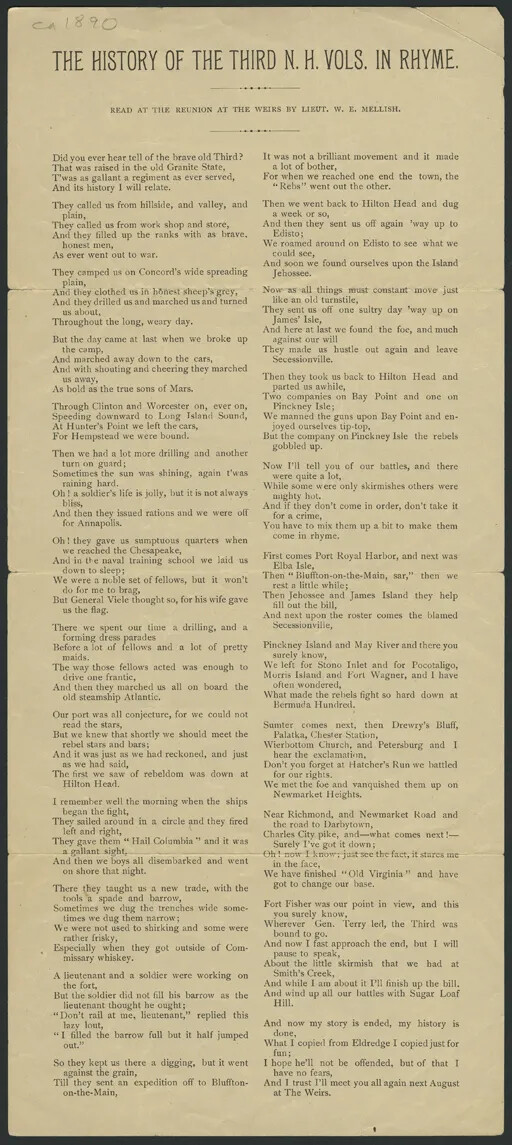 Beginning in the early 1870s, veterans’ organizations began hosting reunion events that usually consisted of a banquet and speakers. In 1875, the New Hampshire Veterans’ Association brought all of these groups under one umbrella organization with the goal of maintaining the bonds among former soldiers. That fall, the group hosted a statewide soldiers’ reunion held over three days in October at the Manchester fairgrounds.